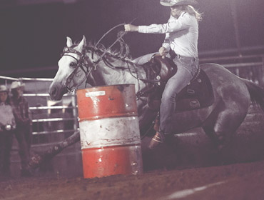 Dans le cadre d'un rodéo, cette discipline est réservée aux dames. C'est une course contre la montre. La cavalière doit contourner trois barils placés en triangle dans le manège de manière à ce qu'elle puisse y faire un parcours en forme de trèfle. Elle doit s'exécuter le plus rapidement possible sans faire tomber de barils. Elle a le choix de prendre le départ du côté gauche ou du côté droit en respectant obligatoirement le parcours.