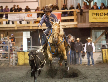 Après avoir fais marche arrière juste ce qu'il faut pour maintenir un bonne tension sur le lasso, le cheval s'immobilise. Le veau doit rester attaché un minimum de cinq secondes après que le cavalier soit remonté en selle et ait fait avancer son cheval d'un pas. Le juge annonce alors que l'attache est en règle et confirme le temps obtenu par le cowboy.