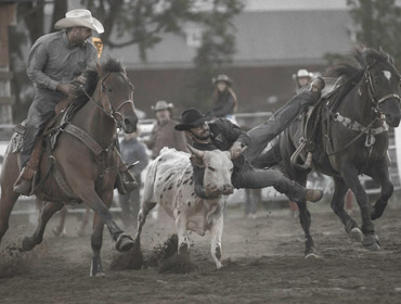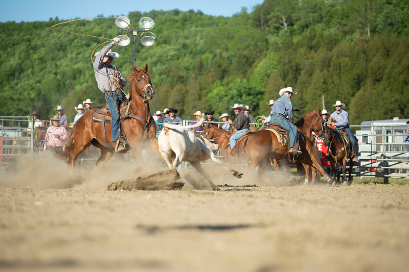 Le « Team Roping » est la seule épreuve en rodéo dans laquelle deux participants travaillent ensemble et accumulent individuellement des points. C'est aussi une épreuve née du travail de ranch qui se pratique encore aujourd'hui. Le « Header » lance le premier lasso et attrape les cornes du bouvillon. Le cowboy attache la corde autour du pommeau de selle et la tire vers lui, afin que celle-ci devienne raide.