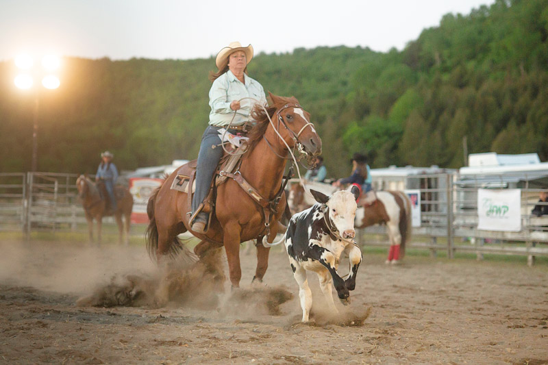 Elle doit quand même attraper le veau au lasso qui est attaché au pommeau de sa selle et au bout duquel se trouve un mouchoir de couleur vive qui, lorsque libéré, indique au juge que le veau est attrapé.